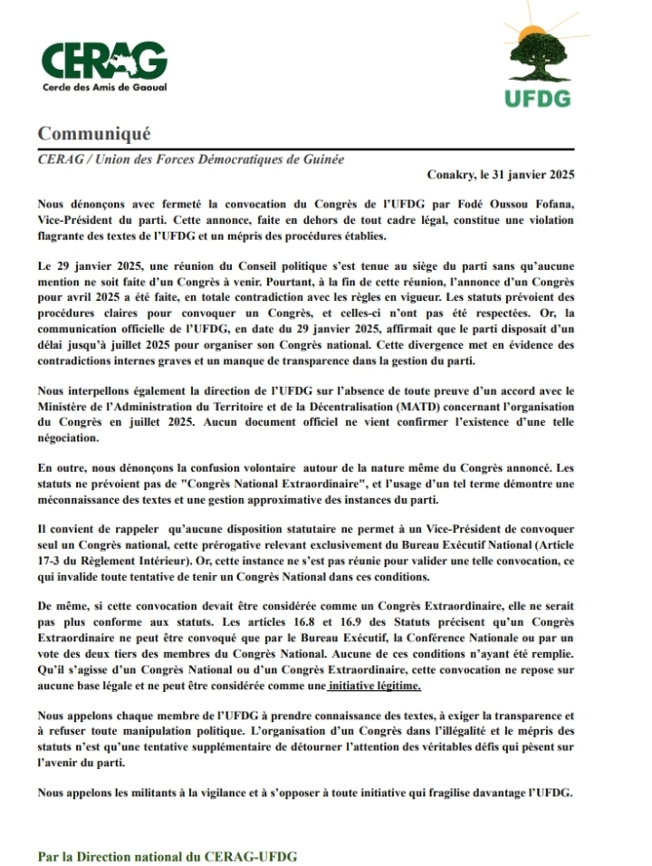 Le CERAG-UFDG souligne que les statuts du parti prévoient des conditions précises pour convoquer un Congrès, conditions qui n’auraient pas été respectées. Le communiqué rappelle notamment que seul le Bureau Exécutif National est habilité à prendre une telle décision, et non un Vice-Président à titre individuel.