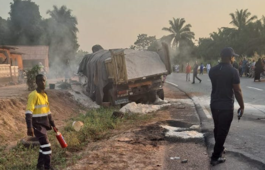 Un camion-benne Iveco (AQ-0238-02) est entré en collision avec un minibus Mercedes (AH-7043-02) transportant des fruits à destination de Conakry. Sous l’effet du choc, le minibus a immédiatement pris feu, ne laissant aucune chance aux passagers.